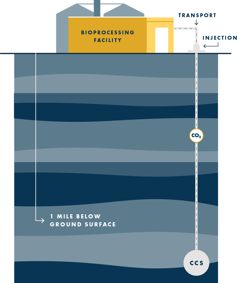 During the fermentation of starch into bioethanol molecules, yeast naturally emits biogenic CO2 that is 99.9 percent pure. An average-sized bioprocessing facility can capture 99,000 to 153,000 tons of CO2 a year, and there is strong potential to expand carbon capture. After the CO2 is captured from our bioprocessing locations, compressed CO2 is transported through short pipelines to underground injection sites regulated by the Environmental Protection Agency (EPA) for permanent storage. There, the CO2 is stored in highly researched geologic formations, where it will remain safely underground for millions of years.