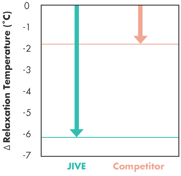 Figure 1 demonstrates that at the same inclusion rate, JIVE can improve the relaxation temperature dramatically in comparison to a commonly used competitor product. Data was collected by bending beam rheometer testing of asphalt binder mixed with 3% of either JIVE or Competitor. The change in the relaxation temperature is defined as the change in the continuous relaxation temperature (Tcont, m) before and after addition of each modifying agent.