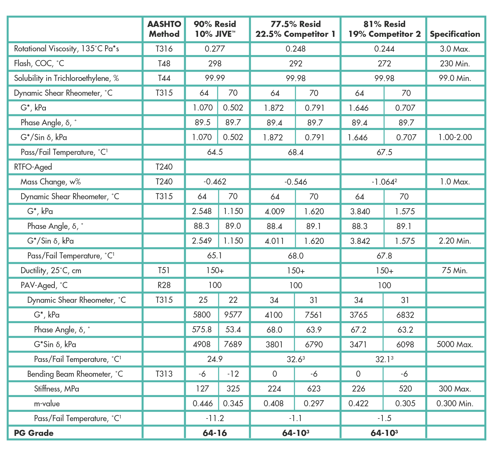 Various commercially available performance-grade (PG) modifiers, including JIVE™, were added to an oil refinery resid (G*: 29.90 kPa, Phase Angle: 86.6, G*/sinδ: 29.96, @ 64°C). An adequate inclusion of modifiers were added to satisfy the AASHTO T315 requirement for complex shear modulus elastic portion (G*/sin, 1.00 – 2.00 kPa). The results comparing the inclusion percentage and PG grades of JIVE against two competitor modifiers are shown in Table 1. Table 1 shows that 10% inclusion of JIVE into the oil refinery resid generates a 64-16, whereas 22.5% and 19.0% inclusion of Competitor 1 and Competitor 2 generate a 64-10 PG, respectively. Therefore, less JIVE is required to obtain a desired PG grade while offering better low temperature cracking resistance.