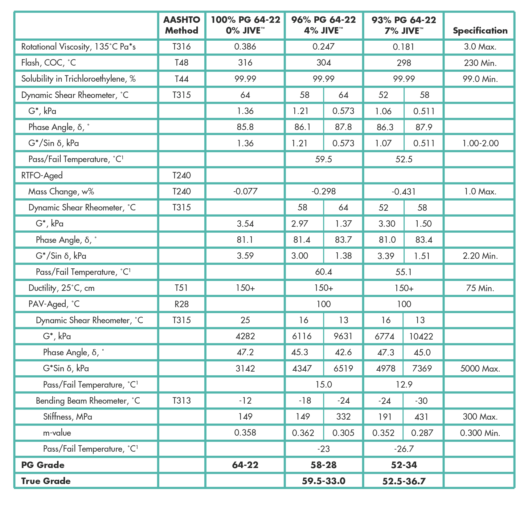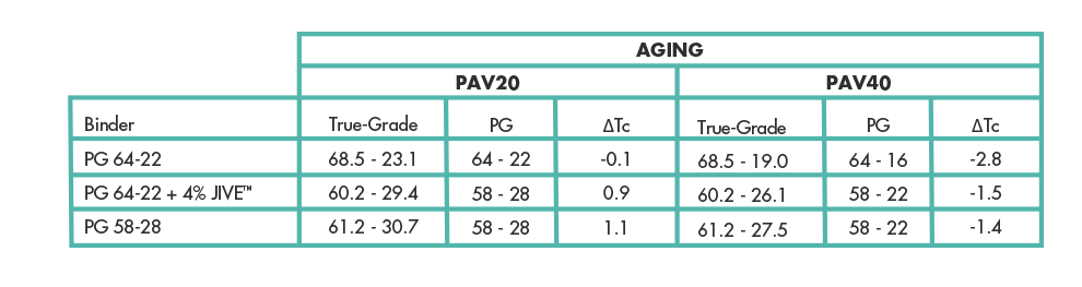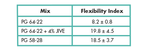 JIVE can also effectively modify PG asphalt to obtain different grades as desired. Table 2 demonstrates that addition of JIVE to a 64-22 asphalt binder obtained from a Midwest source is able to modify the PG to a 58-28 and a 52-34 with 4% and 7% inclusion, respectively.