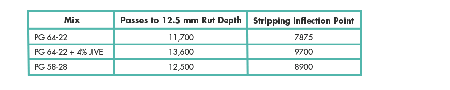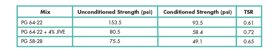 Hamburg rutting evaluation shows that the JIVE asphalt mix performed similar or better compared to the neat asphalt mix in terms of cycles to 12.5 mm rut depth and the stripping inflection point (Table 4). JIVE asphalt mix also performs similarly to neat asphalt mix in terms of I-FIT flexibility index (Table 5). In addition, JIVE contributes to improving TSR values as it performed better than the neat asphalt mix (Table 6). Overall, the data demonstrates that when JIVE is blended in asphalt, the produced asphalt mix performs the same or better than asphalt mixes containing neat asphalt of the same grade. This, along with other data collected on high RAP mixes, validates that JIVE, in addition to improving mix performance and reducing rutting susceptibility, has a slight antistrip benefit as well.